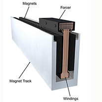 Linear motors are often described as rotary motors cut open and rolled out flat, so they produce motion in a straight line along one axis. Their construction is relatively simple, with a primary part (also referred to as a forcer) that contains windings, and a secondary part that contains magnets. The primary part is typically the moving part, and the secondary part is typically stationary. Iniron corelinear motors, the secondary part is laid out like a track, and inironlessdesigns, the secondary part is often constructed with two magnet tracks facing each other and the primary part riding between the two magnet tracks. Support for the moved load is provided by recirculating linear guides or air bearings.