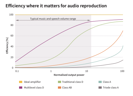 Efficiency measures the production of sound for a given amount of power. The efficiency of audio amplifiers varies widely. Less efficient amplifiers generate relatively more heat and produce less sound power. For example, a typical class A/B amplifier is about 50% efficient. That means an amplifier rated for 100 W of output power would also dissipate 100W of heat. Class A/B performance in intermediate between Class A and Class B. Class A amplifiers are often considered the gold standard for audio quality in many audiophile circles, but they can have efficiencies as low as 15% to 35%. Class B amplifiers have efficiencies over 75%, but they suffer from crosstalk and distortion. Class A/B amplifiers have good sound quality and efficiencies between Classes A and B. Class D amplifiers use switch-mode power technology to achieve efficiency levels up to 90% with very good sound quality. Not all Class D amplifiers are created equal, multi-level Class D designs can be much more efficient compared with conventional Class D implementations (Figure 1).