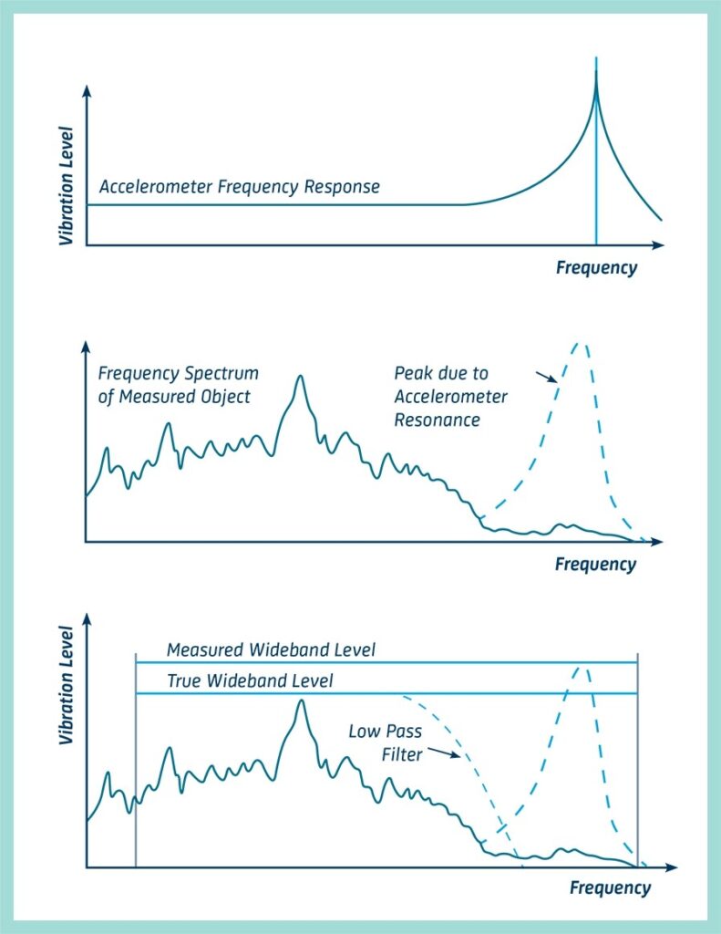 大型通用加速计输出量可低至20khz加速计可高频反射误差,因为加速计固有共振生成宽带读取时可能导致误差选择宽频带设备并加低通滤波常入振荡传感器和预增压器内,可减少加速计共振问题图1)另一种选择是低频测量时,高频共振效果可使用机械滤波来减轻,像橡胶层放在加速度计和加固表面之间