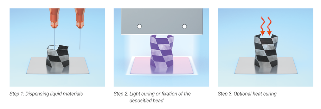 用于液体增材制造的3D打印机可以根据制造需求定制。点胶头,固化灯和轴系统共同选择,以满足客户的工艺要求。还可以考虑其他处理步骤,如拾取和放置。此外,点胶头和固化灯可以集成到现有的装置和生产线中。印刷工艺可与其他制造工艺相结合,提高制造灵活性。
