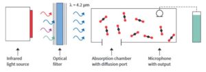 Identified in the 19th century, thephotoacoustic effectallows the conversion of light into sound and has been employed in devices such as non-dispersive infrared absorption spectroscopy (NDIR), which was the first commercially available device to detect gases using this effect. Modulating the light intensity produces a periodic pressure variation, which is measured with a sound-detecting device like a microphone. Criteria to compare different implementations of the photoacoustic effect include selectivity, sensitivity and size.