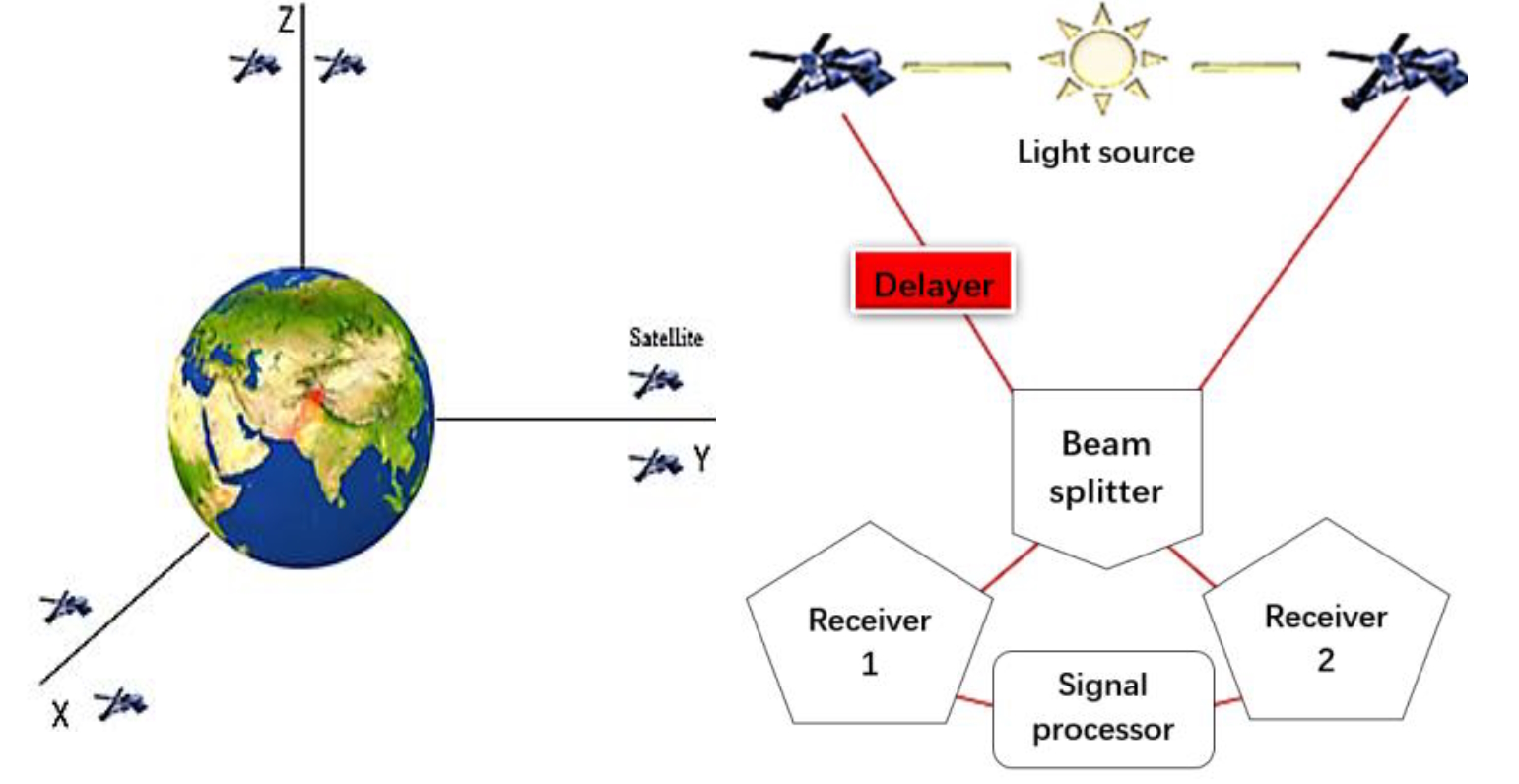 每一基准由半导体激光器、延时滤波器、波束分解器和2枚波段检测器组成激光向两颗卫星发送波束卫星QPS测距过程需要多联动光子调整延时以最小化嵌入光子数,路径传播时间相同通过计算延迟滤波生成延迟数和卫星间距离,可计算目标位置