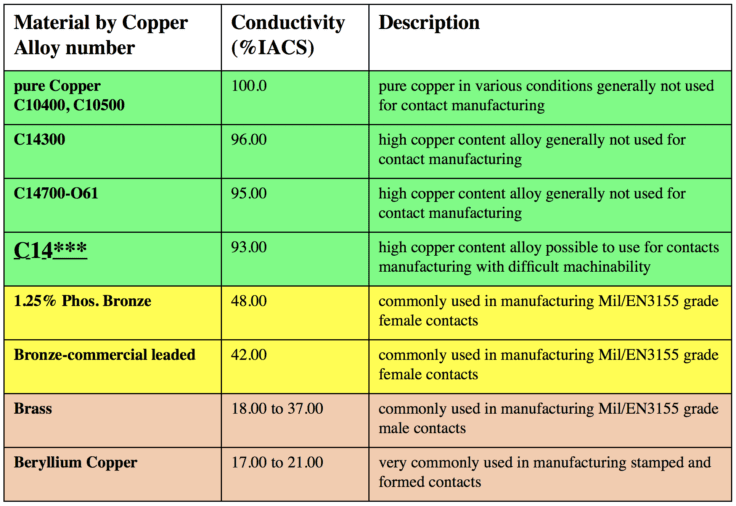 采用高导电性合金。触点应使用国际退火铜标准(IACS)定义的电导率接近100%的材料制造(表1)。不建议使用黄铜或铍铜等材料,因为它们的电导率较低。而且,某些类型的金属是禁止用于航天器的。根据NASA eeinstet -002关于零件选择、筛选、鉴定和降额的说明,镉、锌、化学涂层镉、锌或银不能用作连接器或接触表面处理。NASA还建议在连接器外壳和触点上使用钝化不锈钢、化学镀镍或镀金。