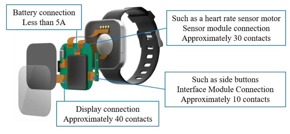 例如,高密度圆形连接器尺寸为06(直径10毫米),包括多达12个0.5毫米电源和信号触点,密度系数为0.83。在另一个实例中,有24个触点的尺寸为08(12毫米)的圆形连接器,密度为0.5。虽然密度没有那么高,但这些连接器比一些同类设备轻了75%。根据应用的不同,重量可能与密度同样重要。尺寸、重量和功率(SWaP)受限的应用,如可穿戴设备,可以在密度和重量之间进行不同的权衡。例如,像智能手表这样的应用程序需要尽可能小的解决方案。小型板对板连接器可用,接触间距在0.35至0.3 mm之间。这些连接器最多有40个触点,最适合智能手表、健康监测传感器和类似的可穿戴设备(图1)。