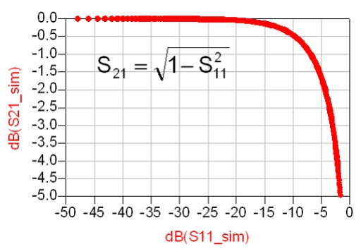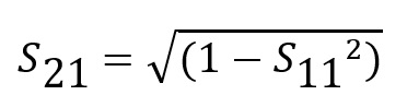 The energy in each S-parameter is related to the square of the S-parameter, so the connection is S11² + s21² = 1, or: